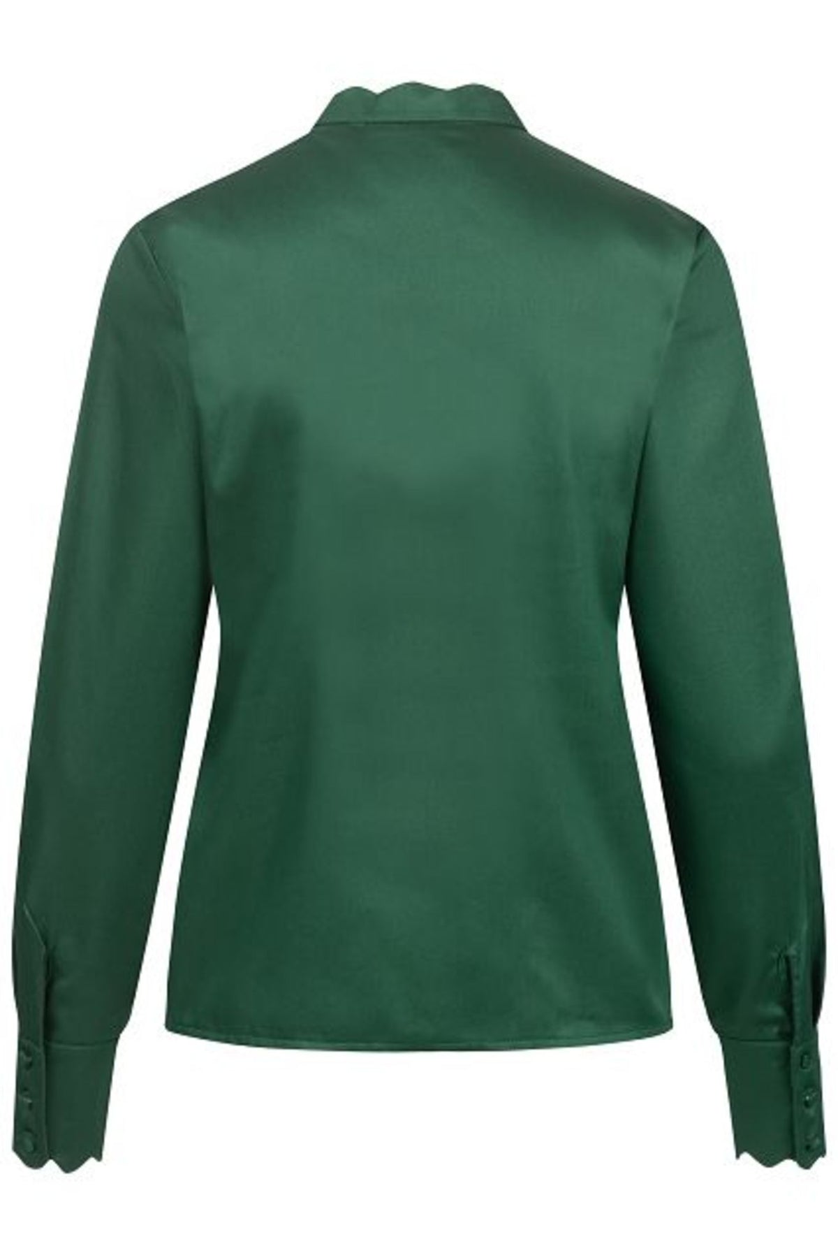 Die Bluse Barbara von Felicitas ist eine zeitlose grüne Bluse mit außergewöhnlichen Details, wie zum Beispiel einem eleganten Stehkragen mit gewellten Bogenabschluss oder breite Manschetten an den Ärmeln. Der Stehkragen wird mit einem schönen Zierknopf verschlossen, ansonsten ist die Knopfleiste verdeckt.