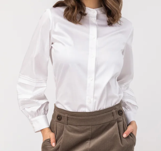 Der schlichte Stehkragen und die durchgehende Knopfleiste verleihen der Bluse eine klare, klassische Silhouette mit moderner Ausstrahlung. Besonders raffiniert ist der Rücken: Ein leicht ausgestellter Sattel mit eingelegter Falte sorgt für zusätzliche Weite und einen fließenden Fall.