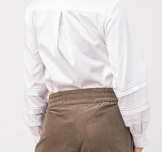 Die Ärmel sind ein weiteres Highlight – großzügig geschnitten und aufwendig gestaltet mit feinem Schnurstepp, kleinen Falten und breiten Manschetten, die mit drei eleganten Knöpfen geschlossen werden. Diese liebevollen Details machen Briana zu einem besonderen Stück, das sich mühelos schick oder lässig kombinieren lässt.