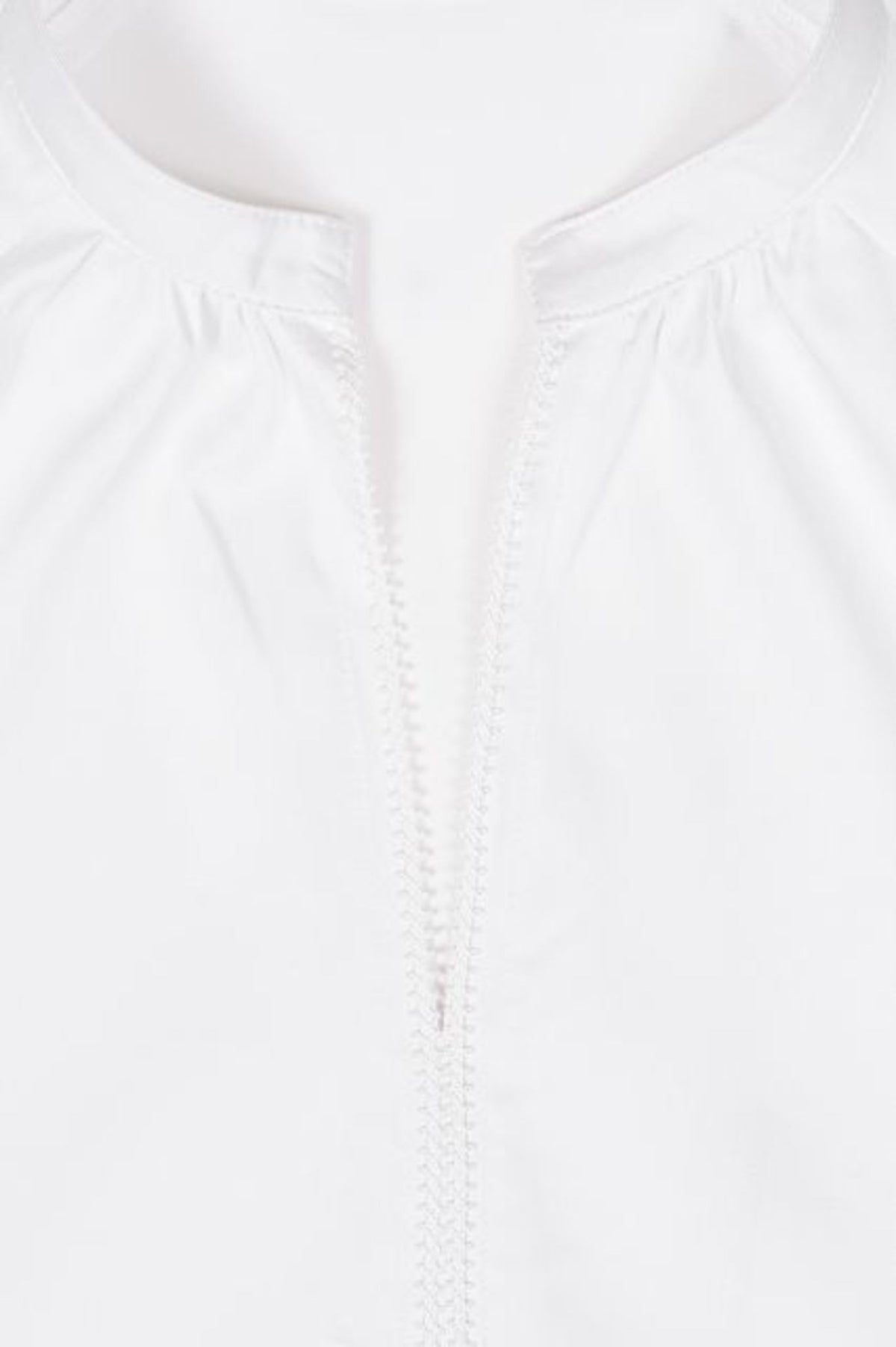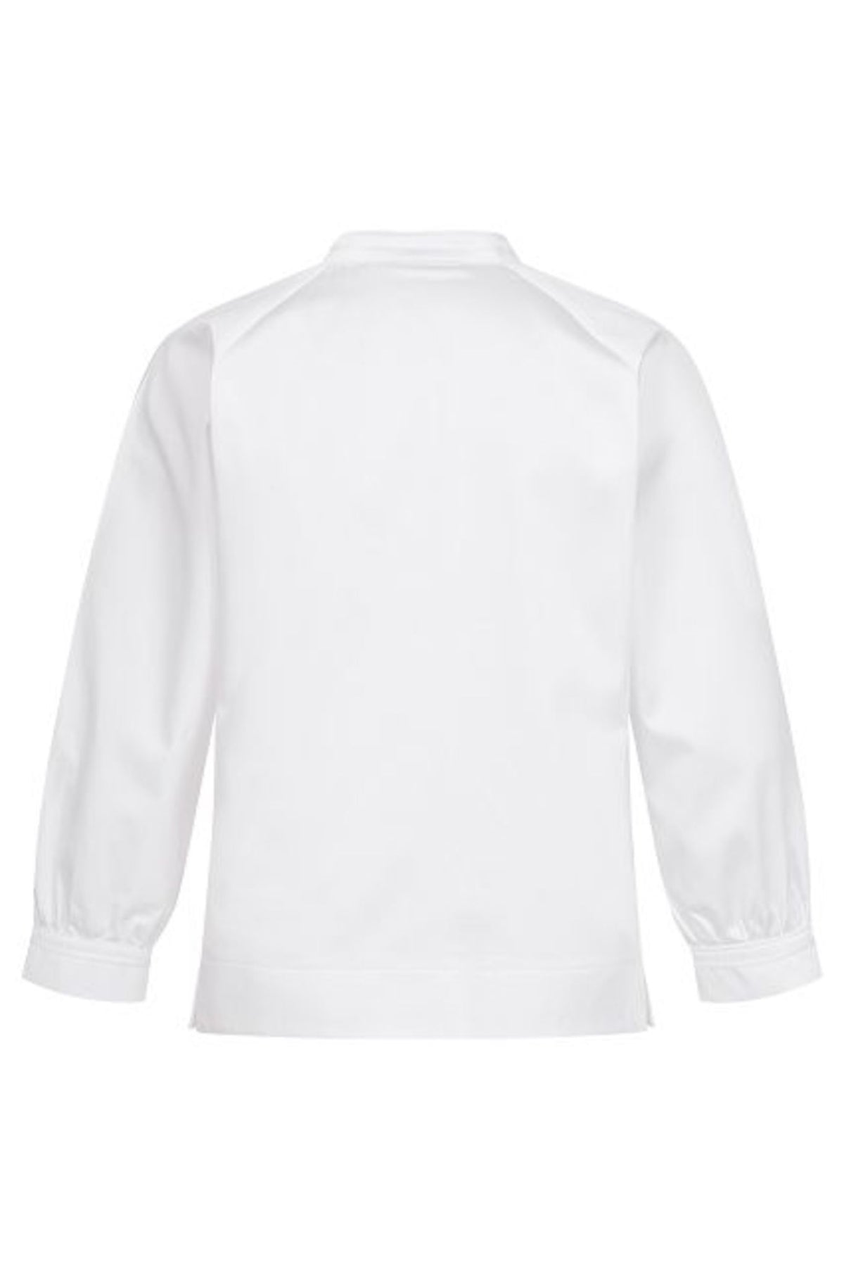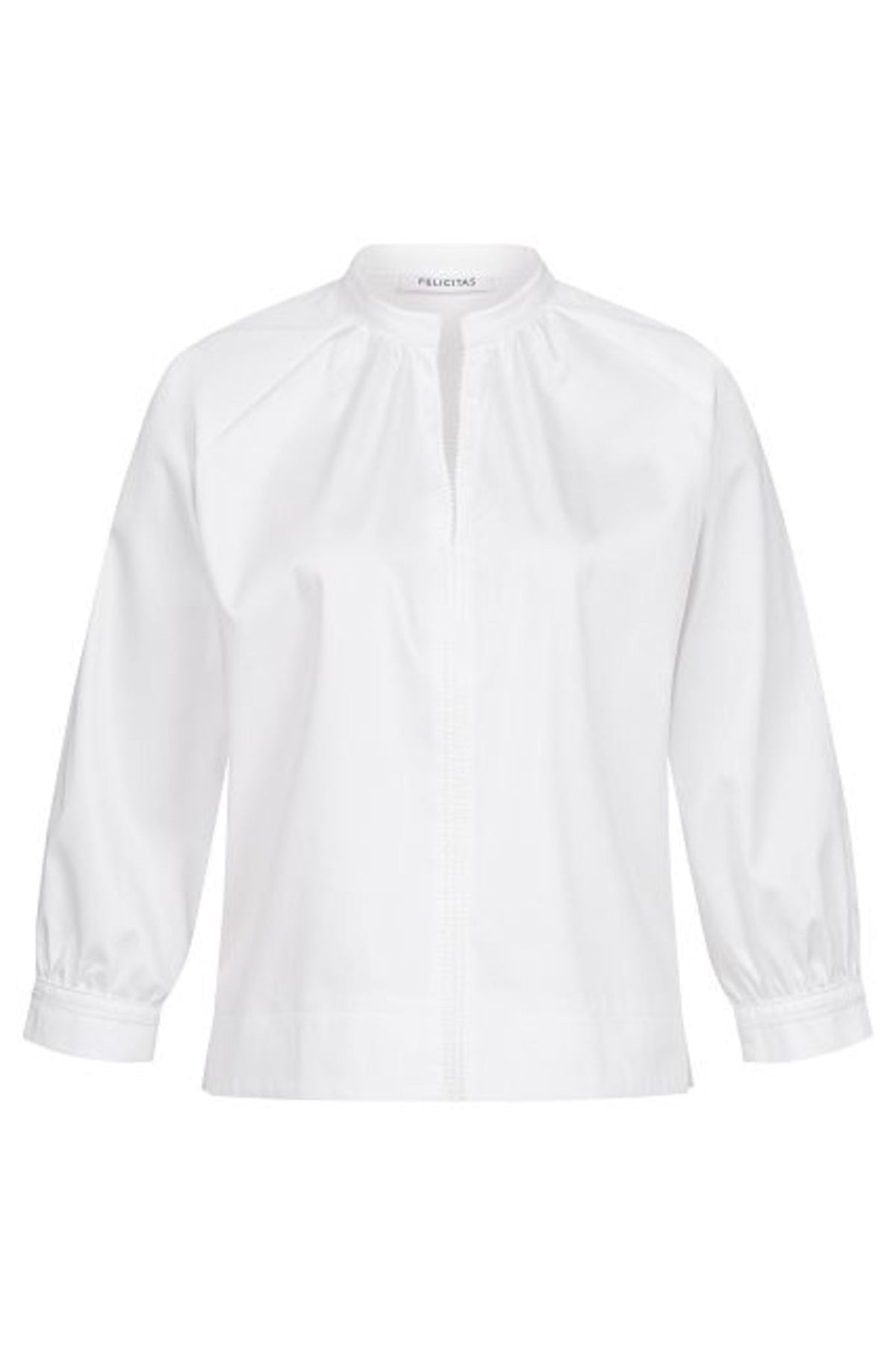 Die Bluse Bruna von Felicitas trägt sich dank der Baumwoll-Stretch-Qualität super angenehm. Sie hat einen feine Stickerei am Ausschnitt, einen kleinen Stehkragen und vorne kleine Zierfalten.