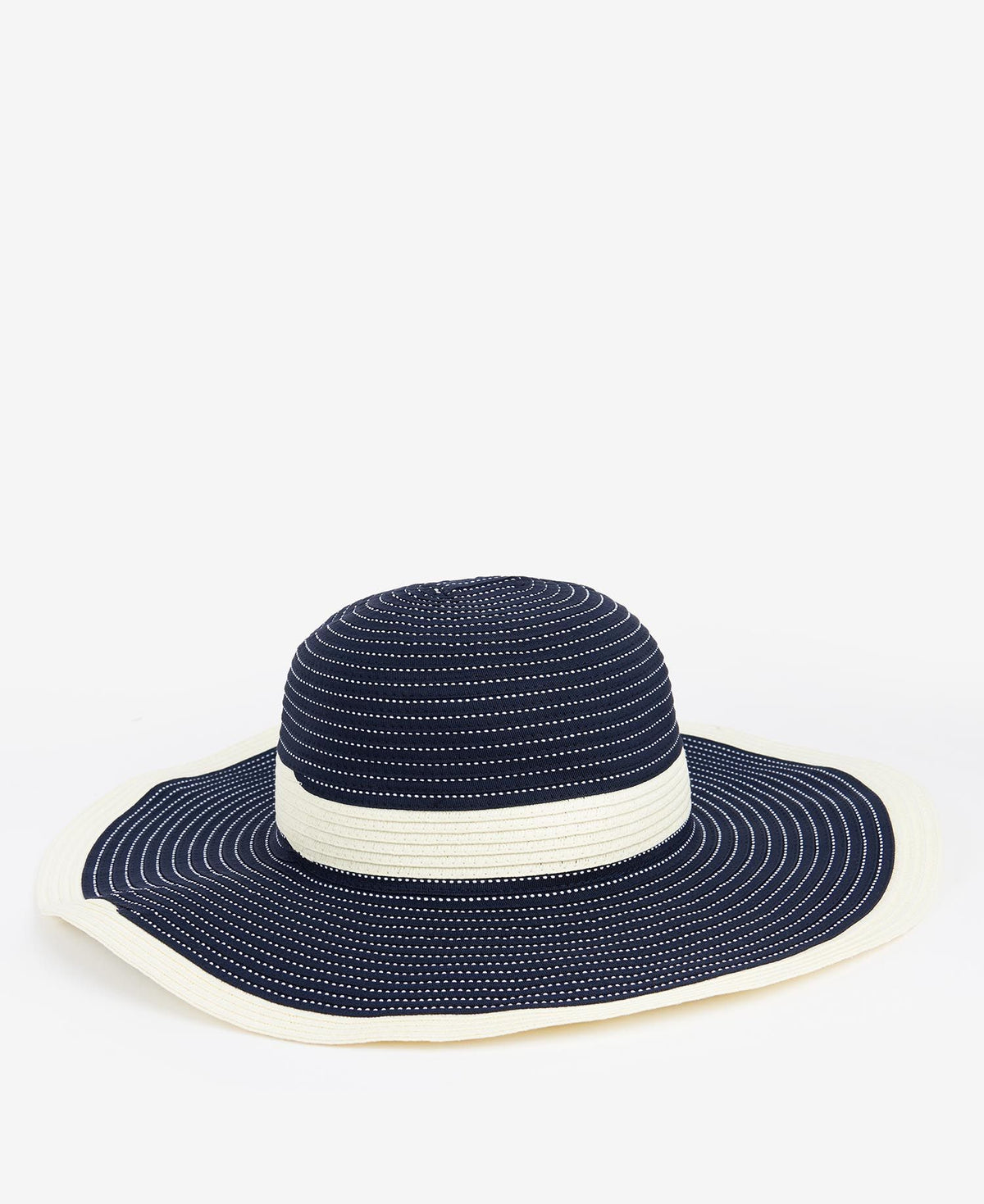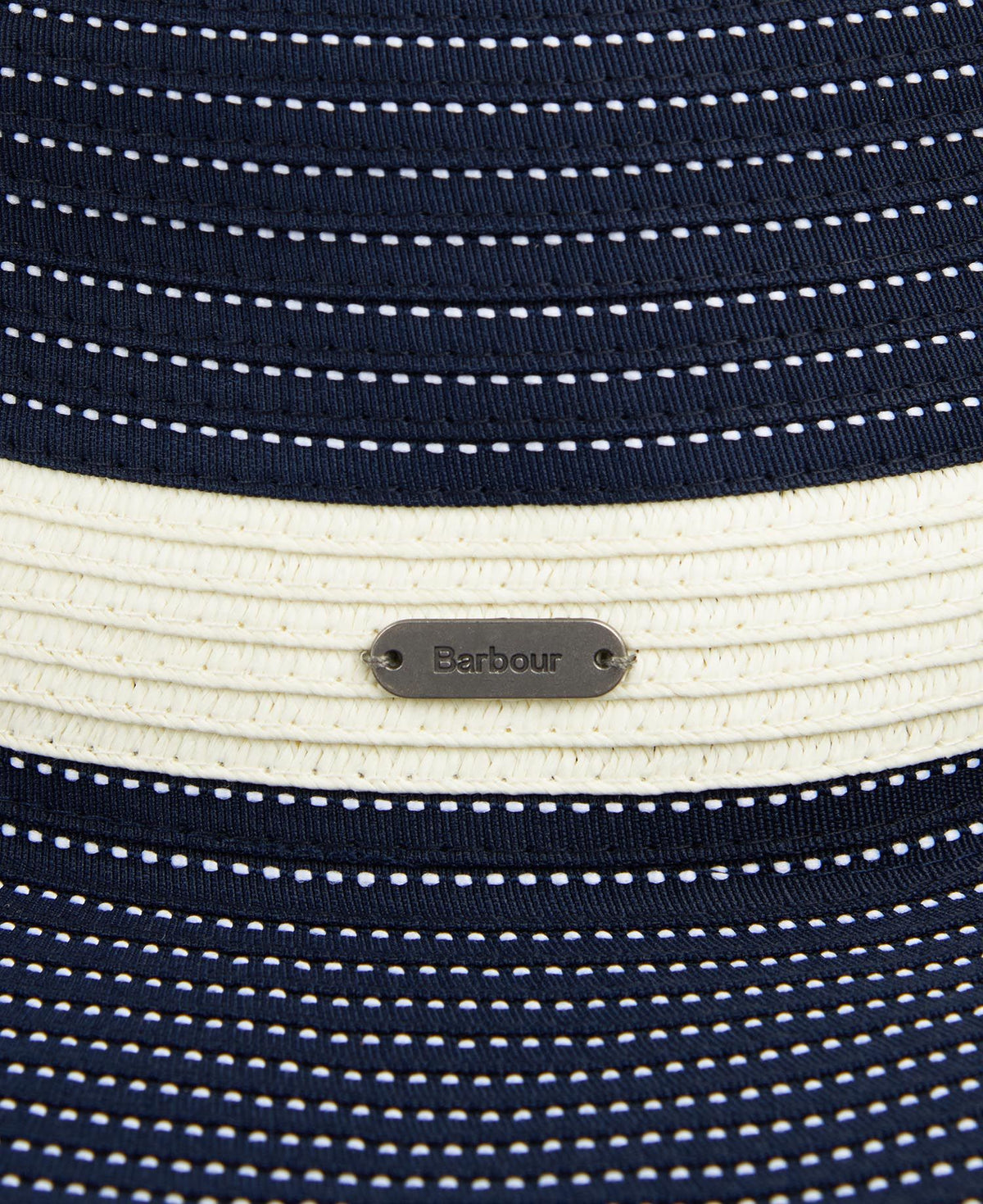 Der verstaubare Sonnenhut von Barbour präsentiert sich zweifarbig mit Kontrastnähten und einem charakteristischen Logoemblem am Kopfteil.