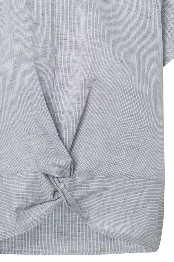 Das blau-weiß gestreifte Design verleiht dem Shirt eine frische, maritime Note, während der lässige Schnitt für eine entspannte Passform sorgt. Ein besonderer Hingucker ist die Knoten-Optik am vorderen Saum, die dem Look eine modische und zugleich legere Ausstrahlung verleiht – perfekt für warme Tage und stilvolle Freizeitoutfits.