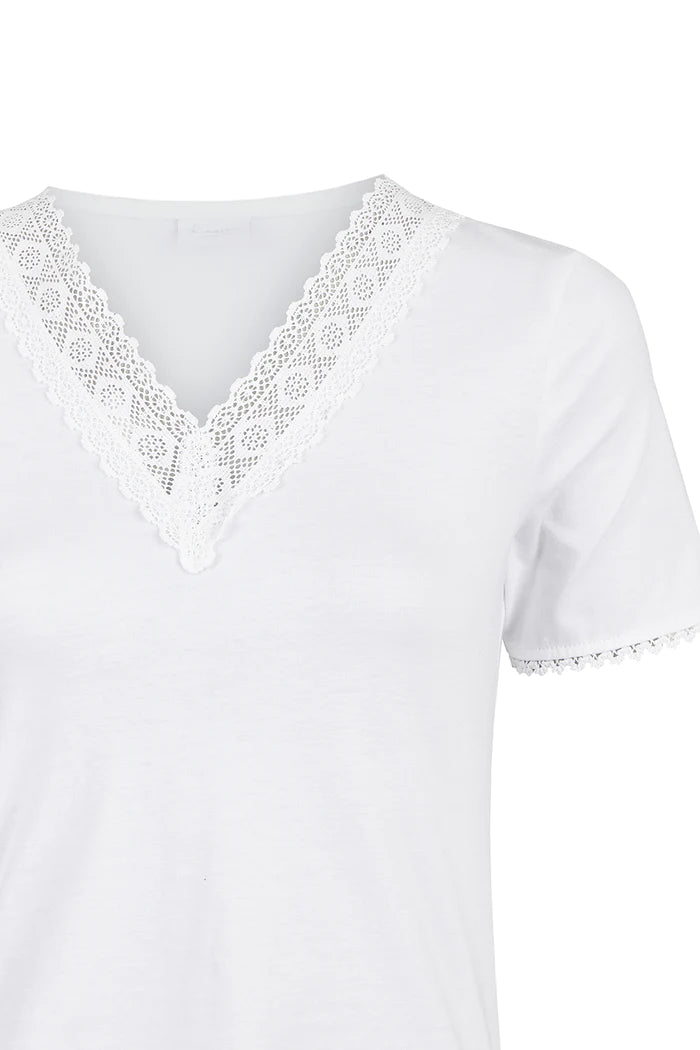 Mit seinem charmanten V-Ausschnitt aus Spitze und den verzierten Ärmelabschlüssen ist dieses Kurzarm-Shirt ein echter Blickfang.