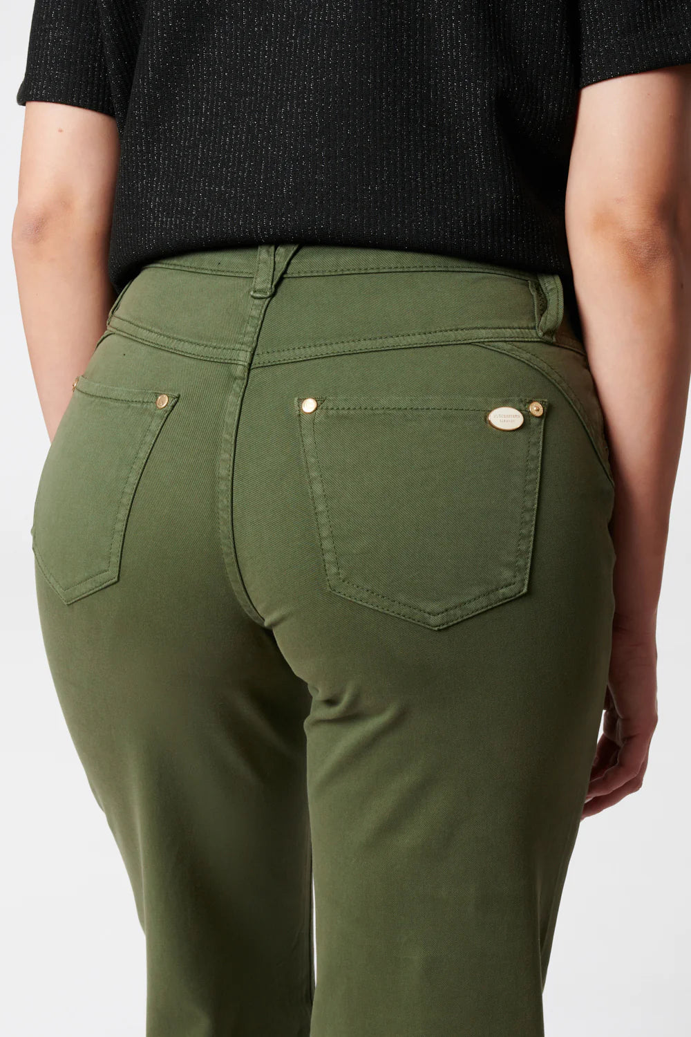 Die hohe Taille sitzt angenehm und zaubert eine schöne Silhouette. In dunklem oliv, kombiniert mit goldenen Knöpfen kombiniert, macht sie zu einem echten Highlight. Ein absolutes Lieblingsstück, das sich vielseitig kombinieren lässt – ob lässig oder elegant.