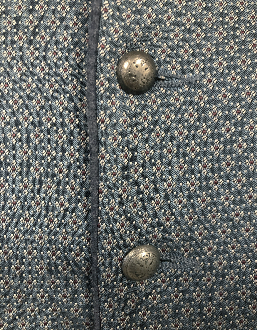 Elegante und doch sportive Trachtenweste aus der Hammerschmid Manufaktur. Der leicht glänzende Oberstoff hat ein Muster in Taubenblau mit weißen und roten Akzenten. Die Metallknöpfe im rustikalen Look runden das Bild ab.