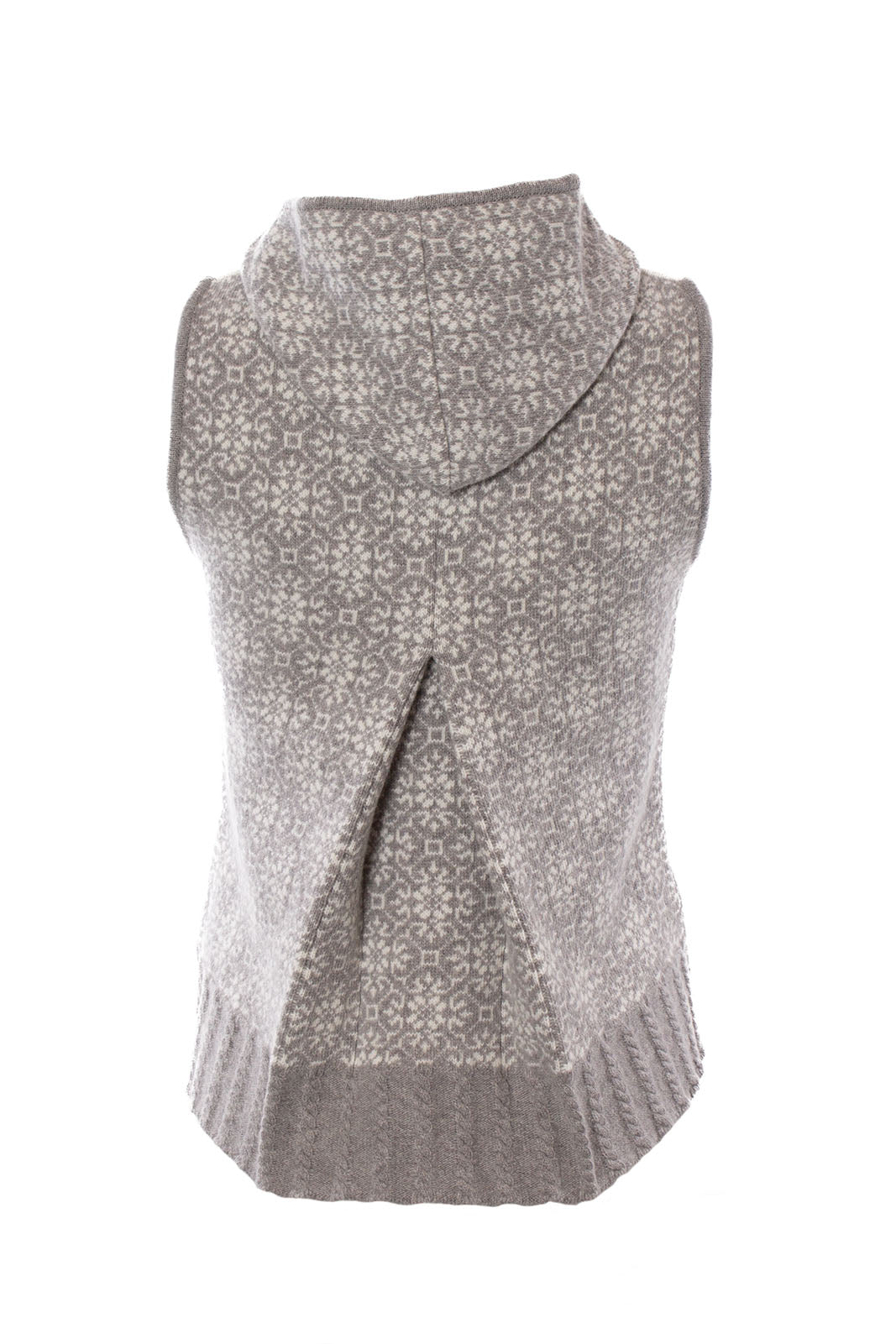Die Strickweste Niri vereint gemütlichen Tragekomfort mit raffiniertem Design. Vorne zeigt sie sich in natürlichem Farbton, während der Rücken in elegantem Grau mit kunstvollen Ornamenten gestaltet ist. Eine graue Einfassung fasst das Modell harmonisch zusammen und unterstreicht den modernen Look.