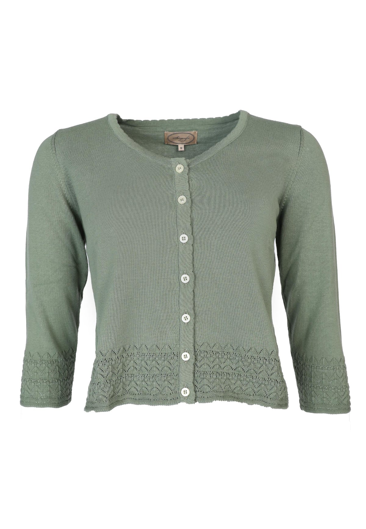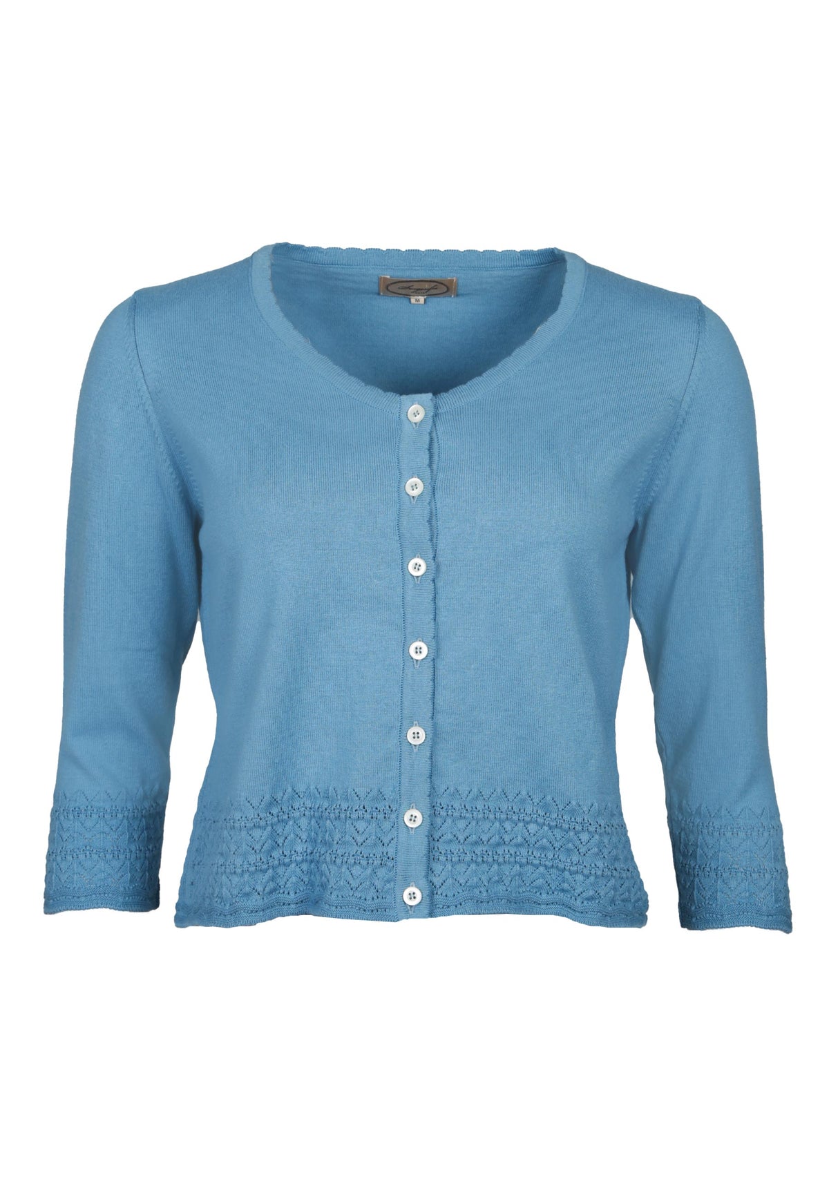 Die kurze Strickjacke Lieselotte besticht durch ihr zartes Lochmuster und die liebevoll gestaltete Muschelkante, die den Ausschnitt und die Säume elegant umrahmt.