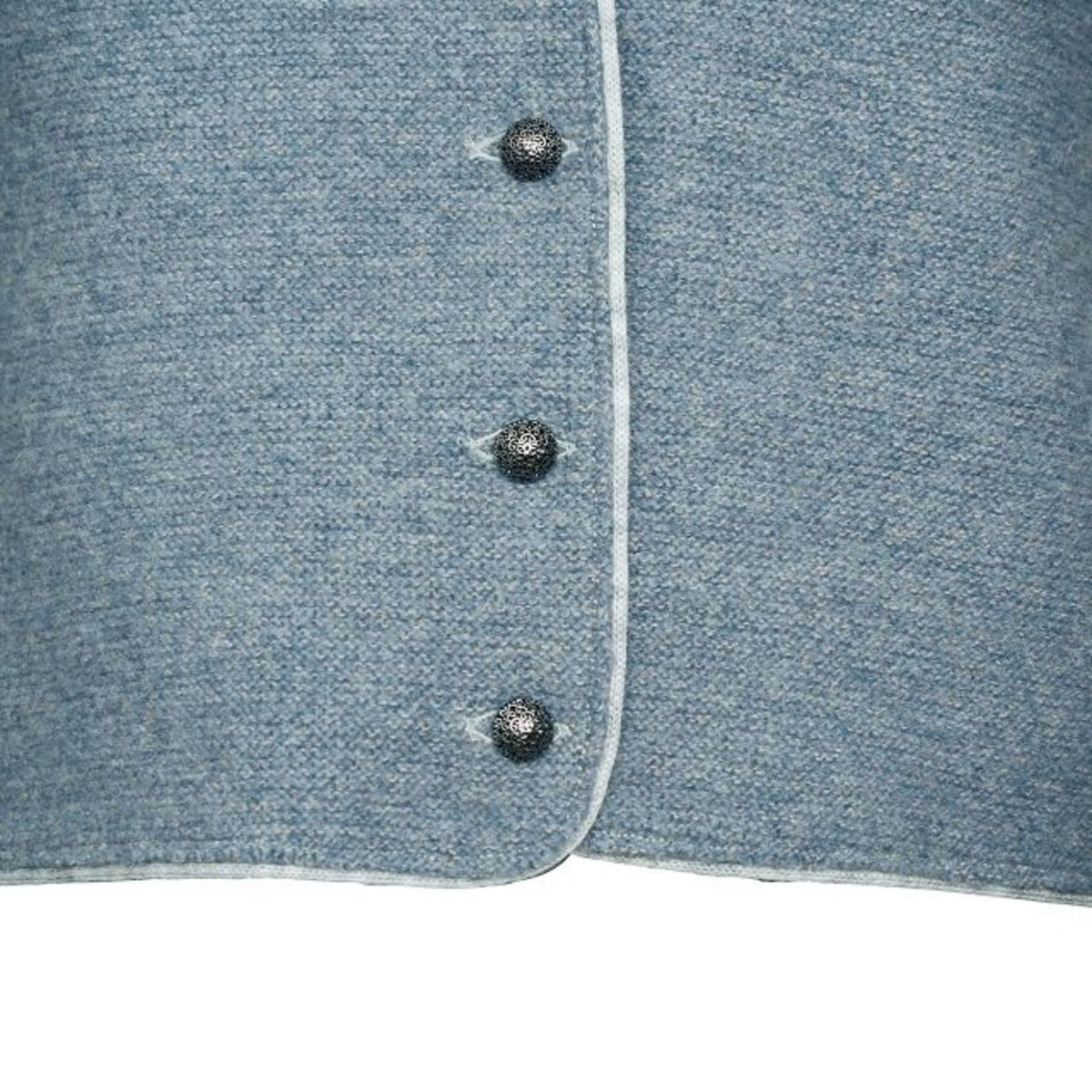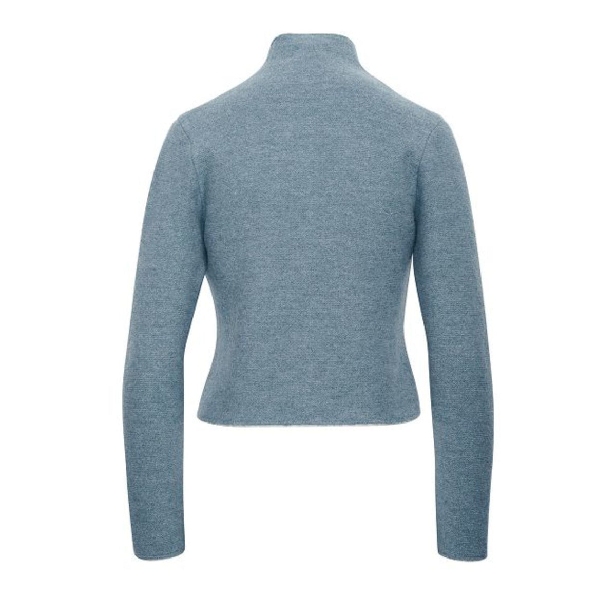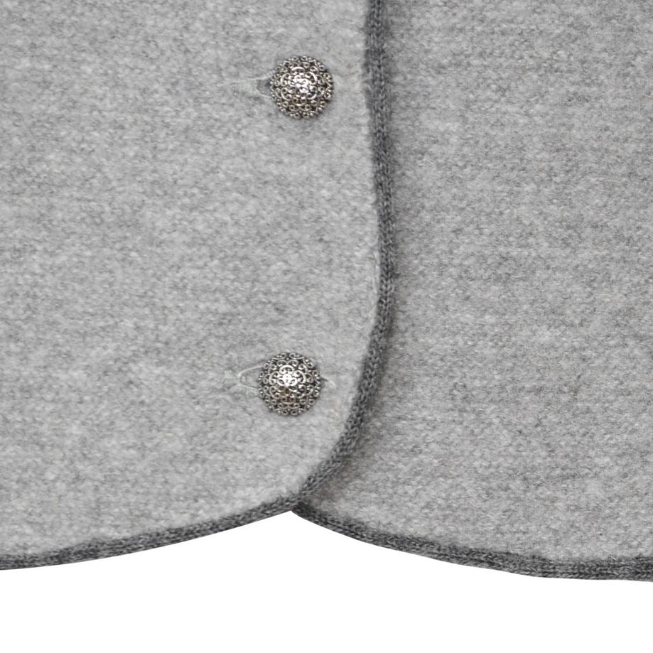 Die feine silbergraue Trachtenstrickjacke Dorika von Stapf hat einen femininen Schnitt und eine zarte Borte in Anthrazit.