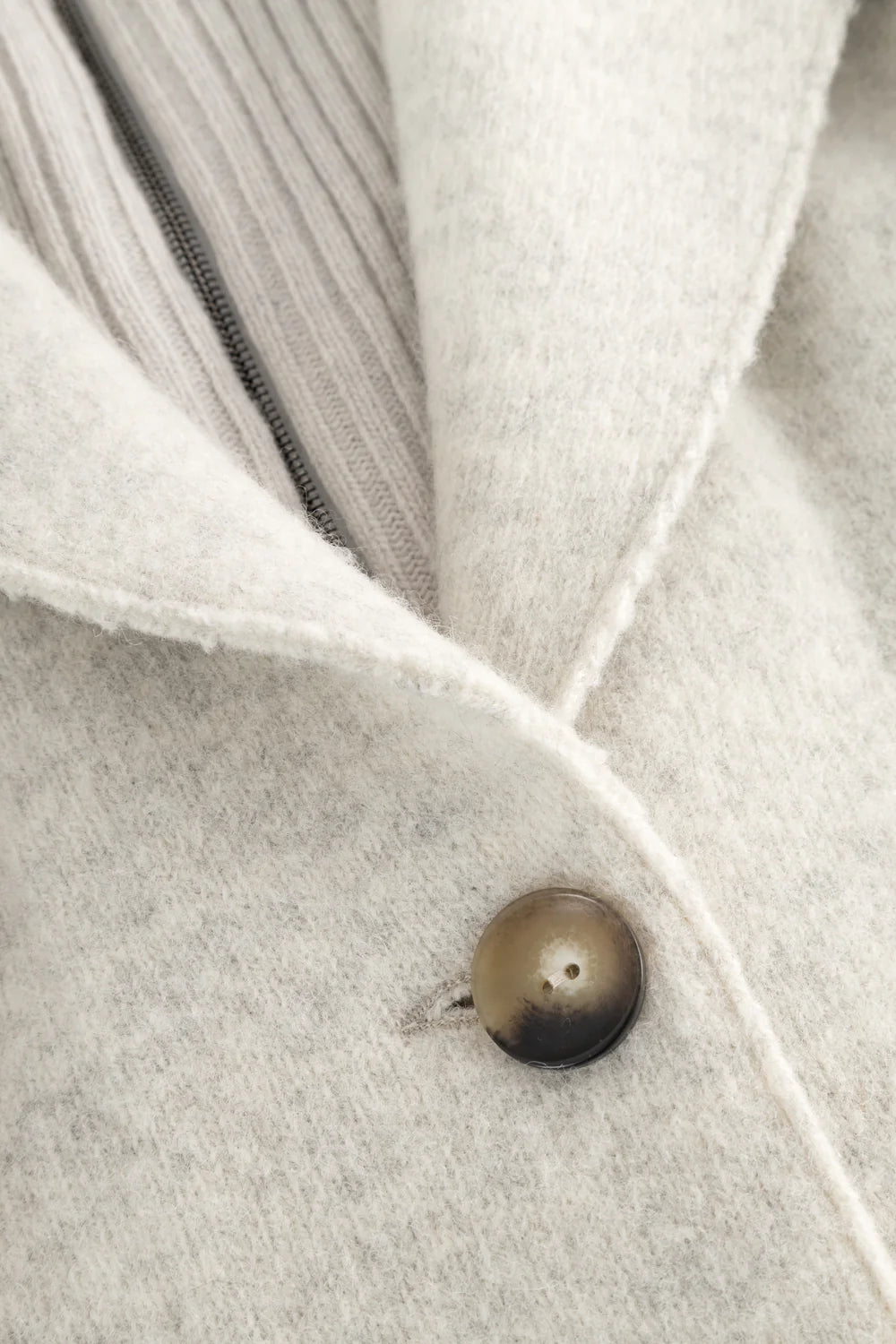 Besonders auffällig sind die Merinostrickeinsätze an den Ärmeln und unter dem Reverskragen, die nicht nur ein angenehmes Tragegefühl vermitteln, sondern auch wohlige Wärme spenden.