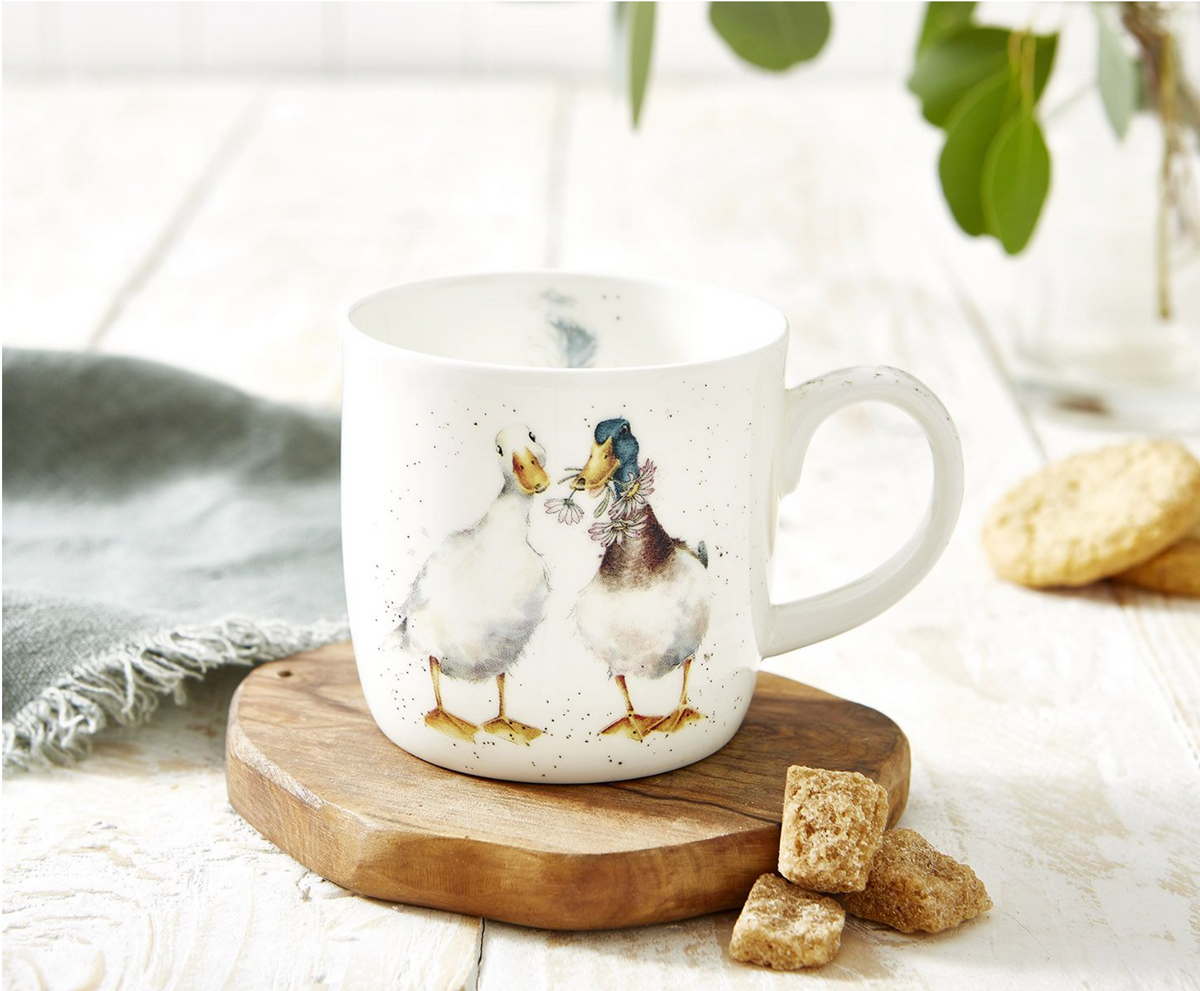 Diese wunderschön illustrierte 'Duck Love' Tasse aus feinstem Bone-China von Royal Worcester ist ein charmantes Geschenk oder eine stilvolle Ergänzung für Ihre Küche. Die Tasse zeigt Enten-Motive auf der Vorder- und Rückseite sowie ein weiteres kleines Detailbild am inneren Rand.