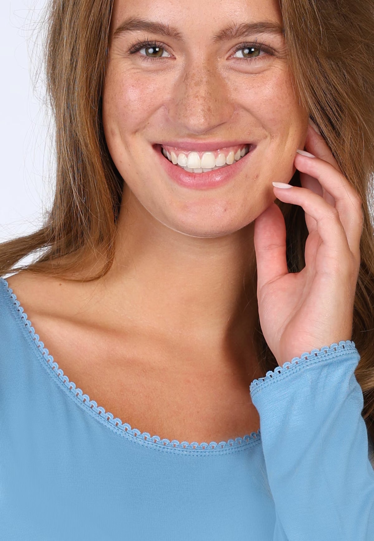 Das Langarmshirt Philia von Sorgenfri Sylt mit klassischem Rundhalsausschnitt wird durch eine zarte Spitze am Kragen und an den Armabschlüssen veredelt, was dem Shirt eine feminine Note verleiht.