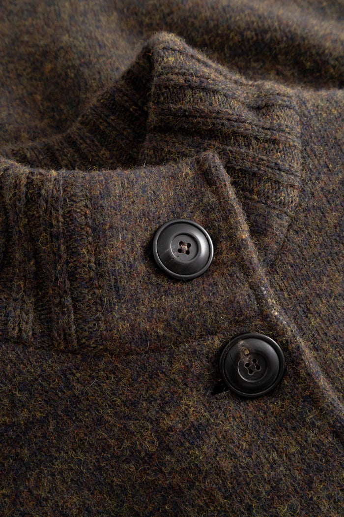 Der elegante Stehkragen, markante Knöpfe und praktische Schlitztaschen verleihen der Jacke eine modische Note und machen es zu einem nachhaltigen Begleiter. Gefertigt aus 50 % Lammwolle (Merino extrafein) und 50 % Bio-Baumwolle wird es in Wörgl, Tirol, gestrickt und gewalkt. P