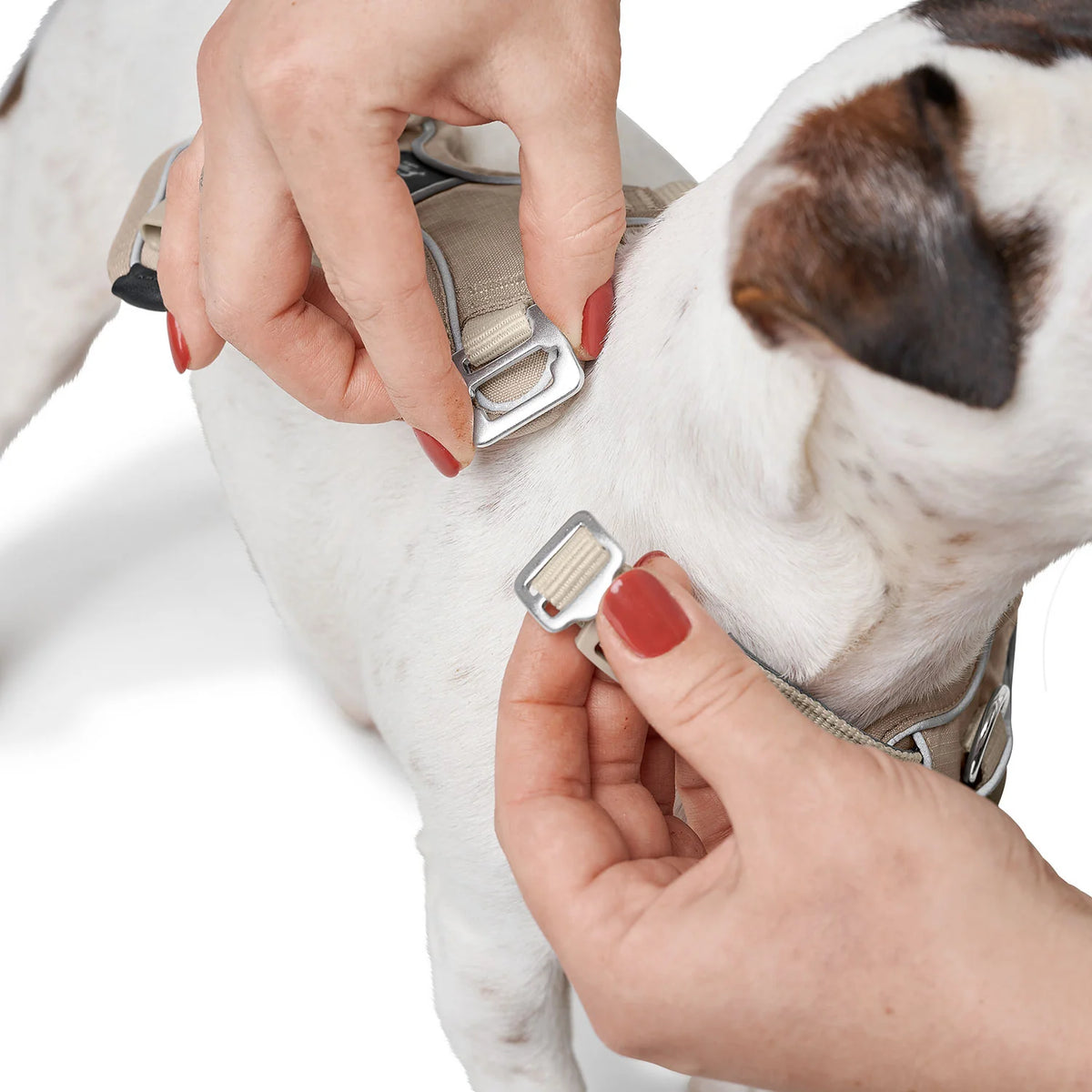 Dank der 5-fachen Verstellmöglichkeit sitzt das Geschirr wie angegossen. Die zusätzliche Einstiegsmöglichkeit vorne erleichtert das Anlegen bei kopfscheuen Hunden. Zwei D-Ringe – am Rücken und im Brustbereich – ermöglichen flexible Anleinoptionen; der vordere lässt sich bei Bedarf einfach verstecken.