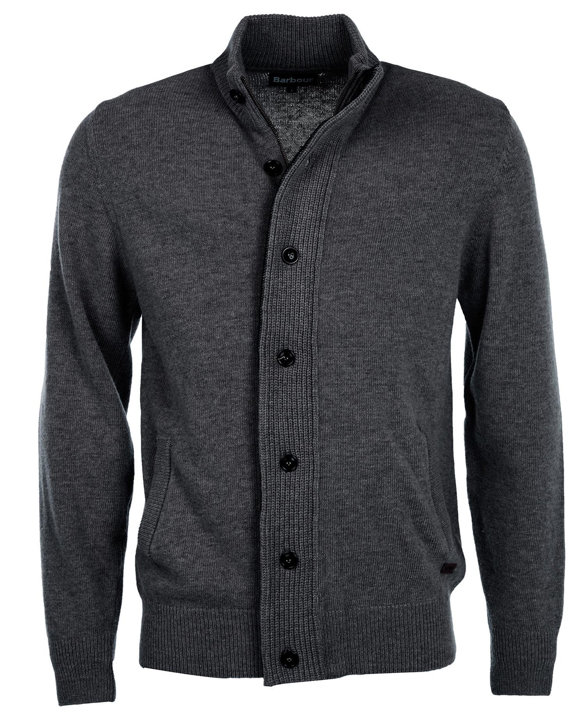 Die Barbour Strickjacke hält nicht nur angenehm warm, sondern besticht durch ihre grobe Strickoptik. Sie hat Ellenbogen-Patches, einen Stehkragen und zwei Seitentaschen.
