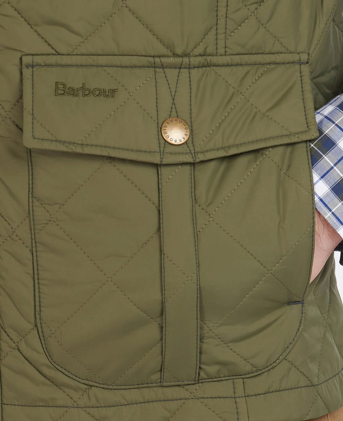 Die Barbour Weste Explorer hat ein charakteristisches Diamant-Steppmuster Muster und einen Stehkragen mit Feincord auf der Innenseite.