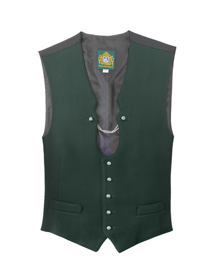 Die Trachtenweste Paul ist durch ihr feines Tuchloden in Waldgrün und den geschwungenen Kragen eine Hommage an die alpenländische Tracht. Gleichzeitig wurden die traditionellen Elemente mit einem modernen Schnitt und einer feinen Kette kombiniert, was diese Weste zu etwas ganz Besonderem.