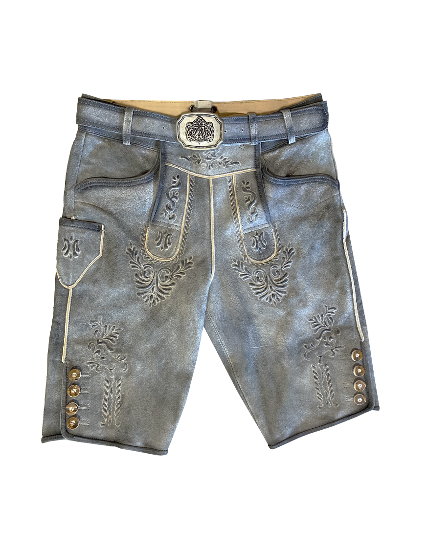Kurze Lederhose in hellem Grau mit leichtem Blauschimmer im sportlich rustikalem Look