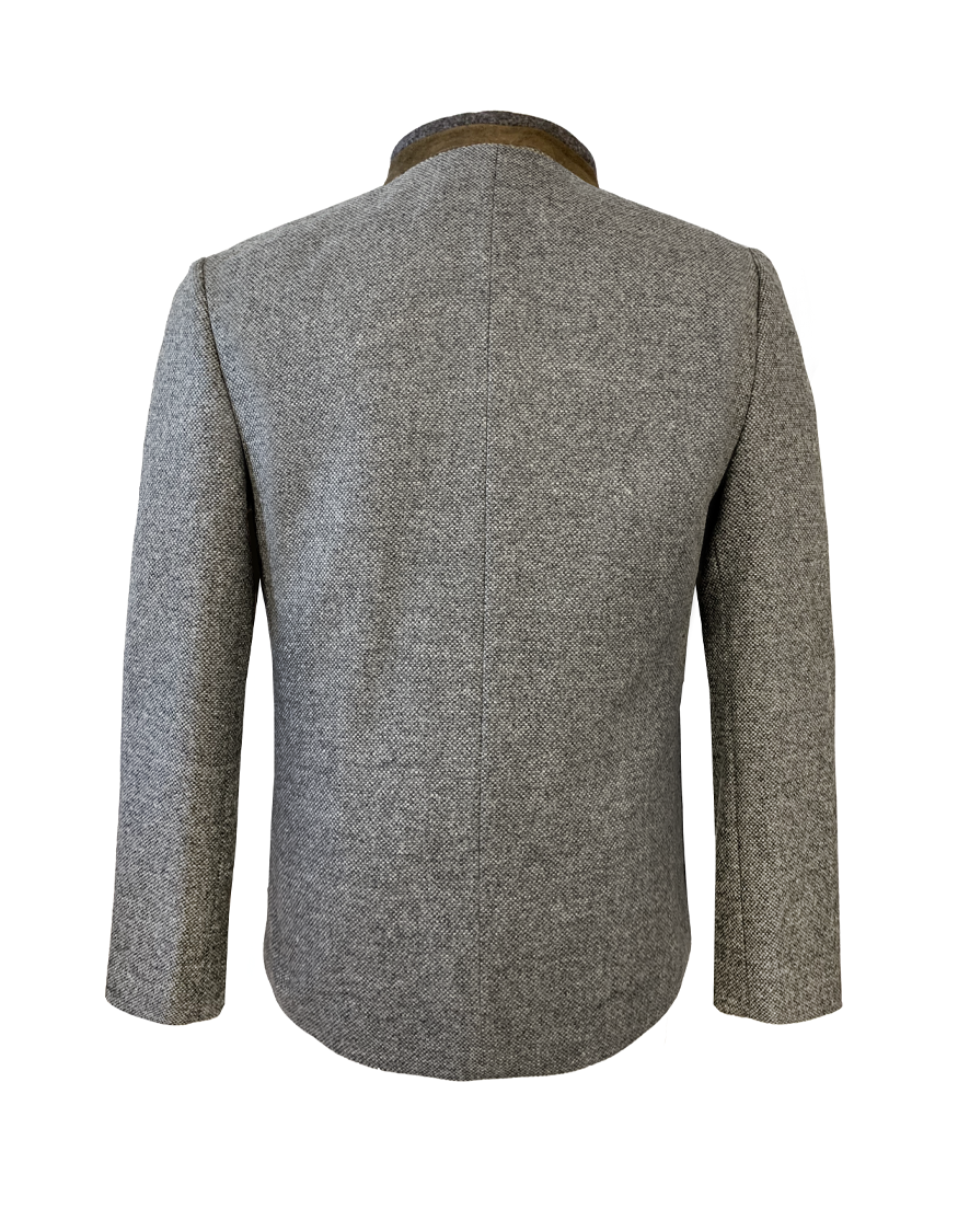 - Kragen und Taschen sind mit dunkelem blaugrauem Tuchloden eingefasst