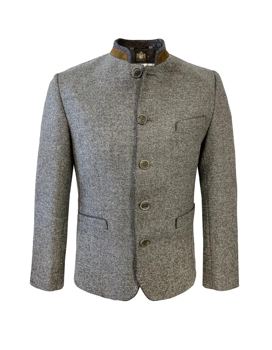Das Trachten-Sakko “Volker“ von Hammerschmid wirkt elegant und dennoch alpenländisch rustikal. Der Kragen und die Taschen sind mit dunkelem blaugrauem Tuchloden eingefasst, den Kragen ziert zusätzlich eine Velours-Borte. Dunkle Hornknöpfe verleihen einen natürlichen Touch.