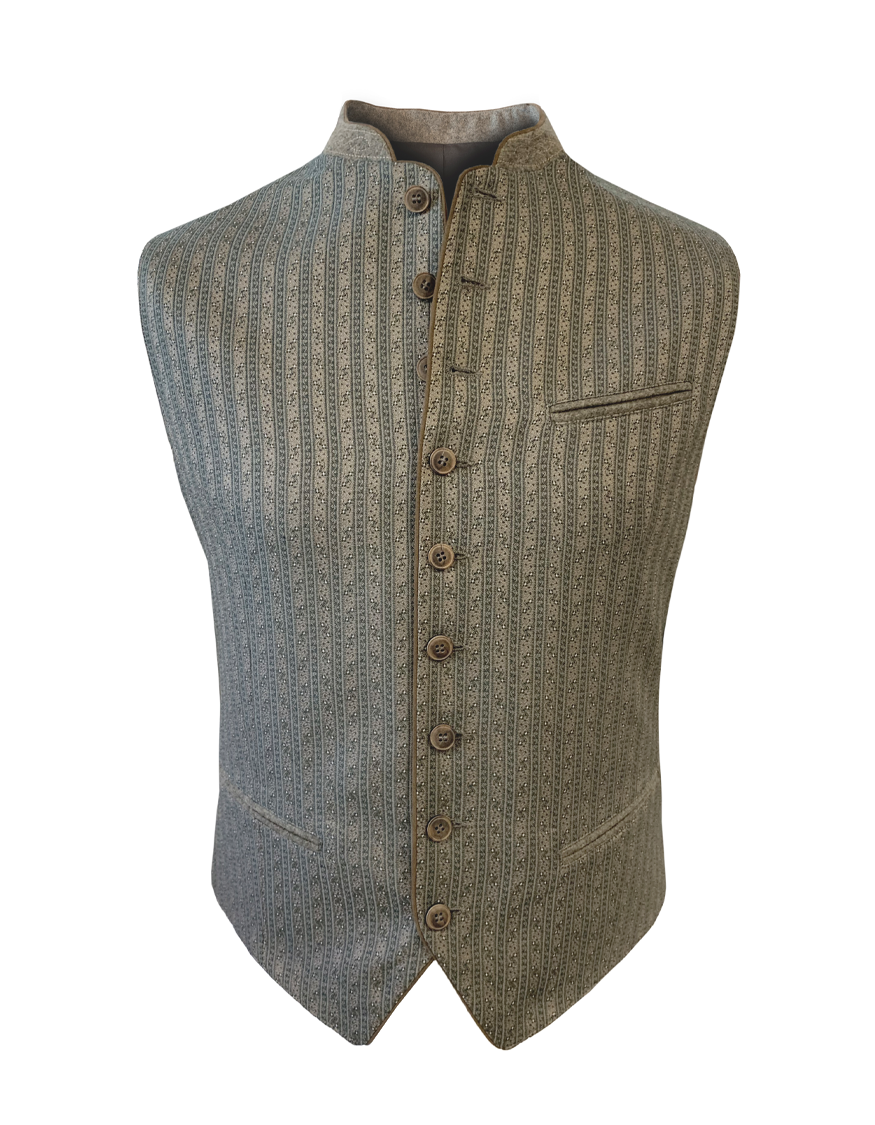 - Kombination: durch die rehbraune Paspel an der Knopfleiste und am Kragen harmoniert diese Weste hervorragend mit einer braunen Lederhose, kann aber auch gut zur Jeans oder Stoffhose getragen werden.