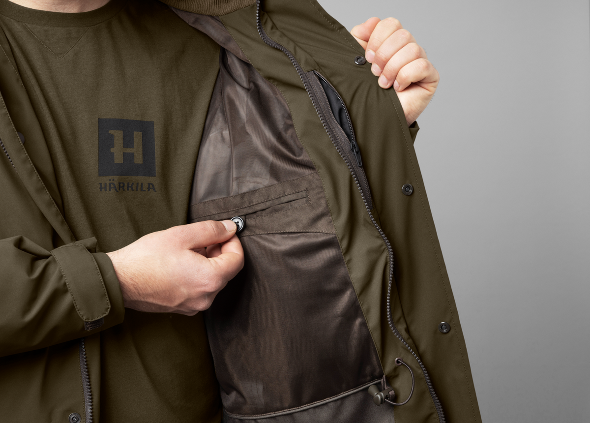 Die Orton Technik HWS Jacke von Härkila ist aus einem laminierten Oberstoff gefertigt und verfügt über eine HWS®-Membran, die sie wind- und wasserdicht macht.