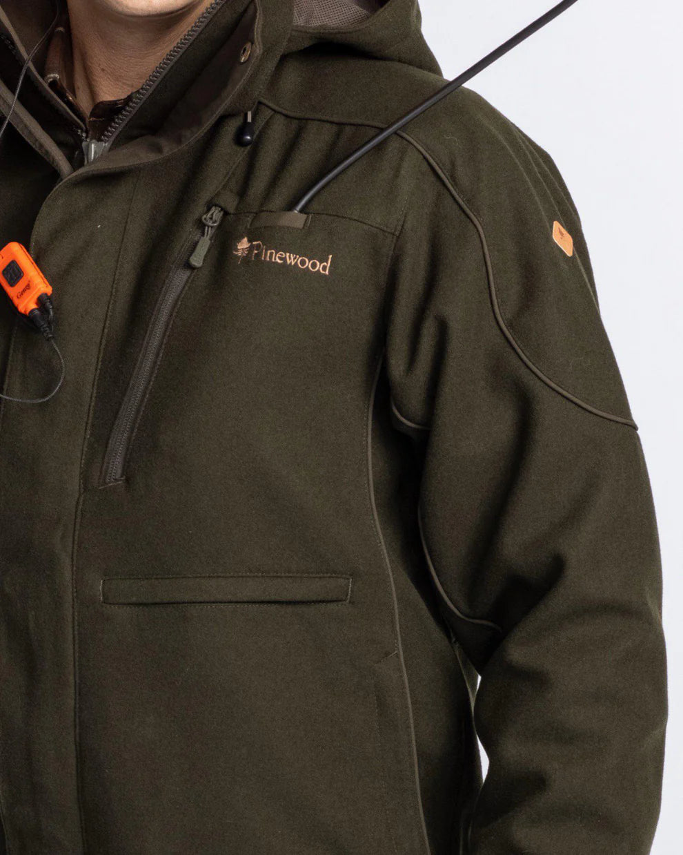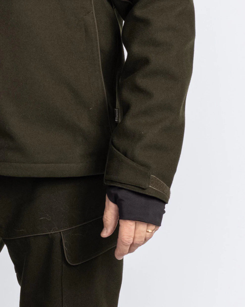 Die Furudal Hunters Wool Jacke kombiniert funktionale Eleganz mit durchdachten Details. Sie besteht aus einer hochwertigen, zertifizierten Wollmischung, die warm, atmungsaktiv und wasserabweisend ist. Wasserdichte Membranen an Schultern und Unterarmen sowie ein Mesh-Futter sorgen für zusätzlichen Schutz und Komfort. Die moderne, normale Passform wird durch praktische Features ergänzt: abnehmbare Kapuze, einrollbarer orangefarbener Kragen, abnehmbare Hosenträger und zahlreiche Taschen – innen wie außen, teils mit speziellen Fächern für GPS und Funkgeräte. Verstellbare Elemente wie Kordelzug, Bündchen mit Daumenlöchern und Klettverschlüsse sowie ein 2-Wege-Reißverschluss erhöhen den Tragekomfort und die Wetterbeständigkeit.