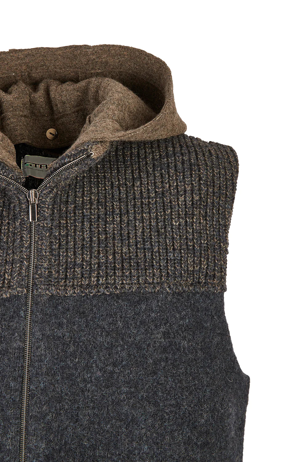 Die Herrenweste Georg von Stapf überzeugt durch ihren auffälligen Materialmix. Durch die farblich abgesetzte Kapuze wirkt sie modern und verleiht jedem Outfit einen sportiven Look.