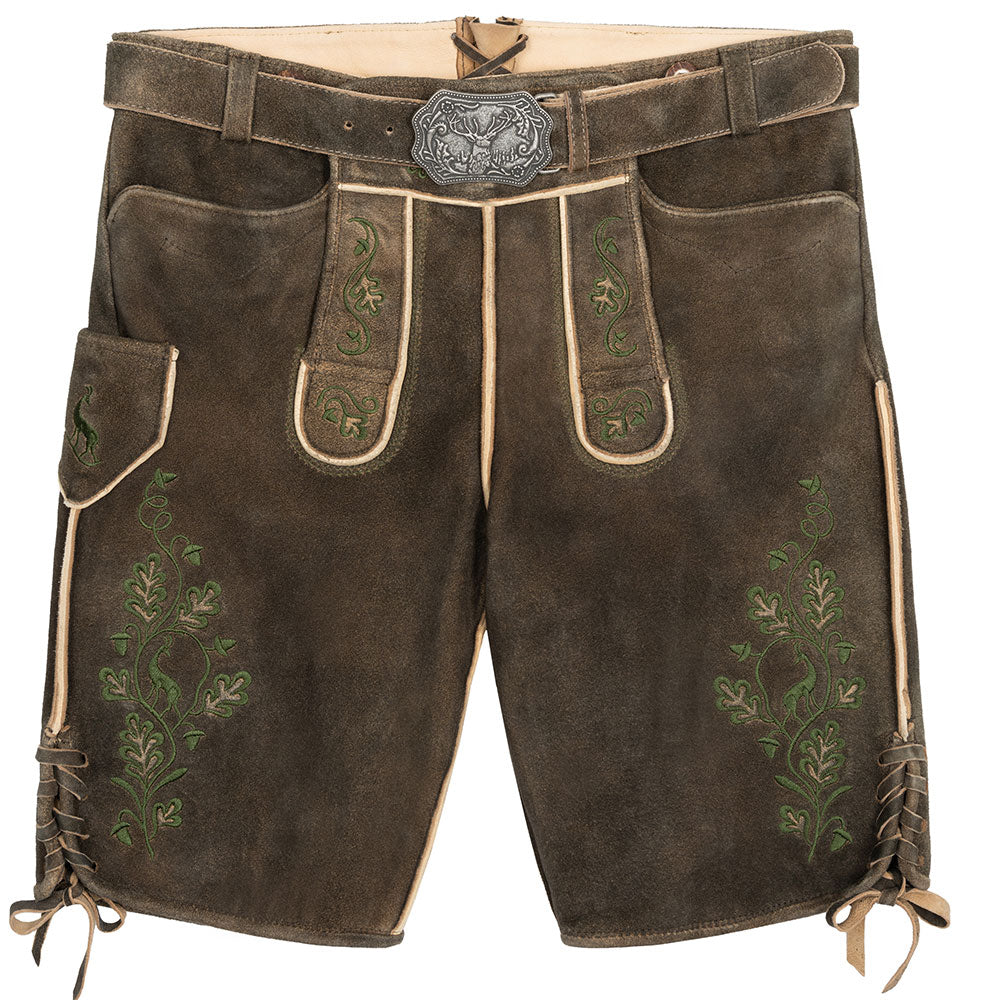 Hirscher Herren Lederhose "Landsberg" dunkelbraun mit grüner Stickerei