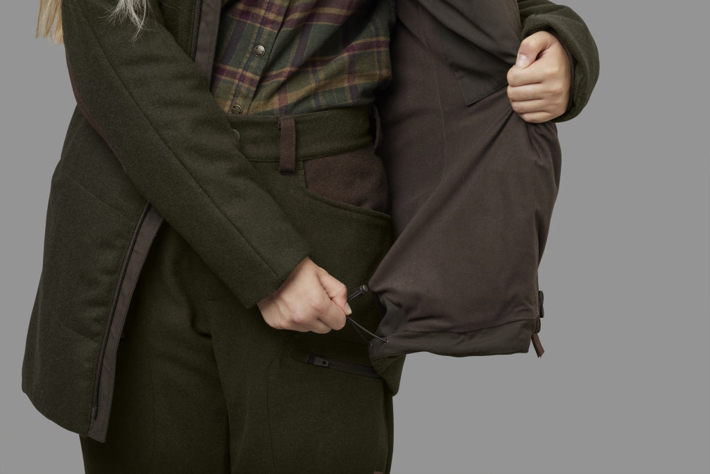 Dank der mehrlagigen Wollstruktur ist die Jacke geräuscharm, temperaturregulierend und atmungsaktiv. Sie reicht bis zu den Oberschenkeln und schützt so den unteren Rücken und die Gesäßpartie. Zur Ausstattung gehören eine Funkgerätetasche mit Reißverschluss und Antennenausgang, geräumige Front- und Stecktaschen, ein 2-Wege-Reißverschluss, eine Innentasche, abnehmbare Kapuze und Verstellmöglichkeiten per Kordelzug an Kapuze und Bund.