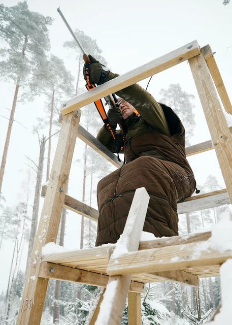 Der Ansitzsack ist geräuschlos, winddicht und extra warm gefüttert für einen längeren Aufenthalt in der Natur bei niedrigen Temperaturen. Sinnvoll ausgestattet mit verstellbaren Hosenträgern und das Fußteil ist mit RV zu öffnen um sich frei bewegen zu können – der Sitzsack stört nicht und ist beim Laufen und besteigen der Ansitzleiter nicht im Weg. Das Fußteil ist mit RV separat zu öffnen, abnehmbar und maschinenwaschbar.