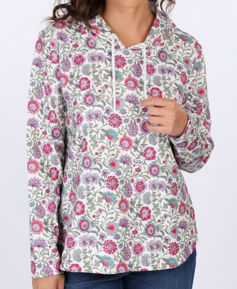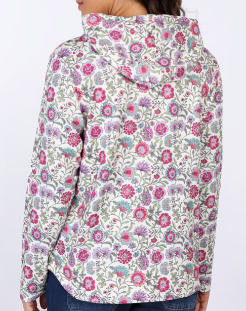 Der Pullover Hilijana von Sorgenfri Sylt kombiniert sportlichen Komfort mit einer femininen, verspielten Note. Der romantische Blumendruck verleiht dem Sweater einen besonderen Look, während die praktische Kapuze zusätzlichen Schutz bei windigem Wetter bietet.