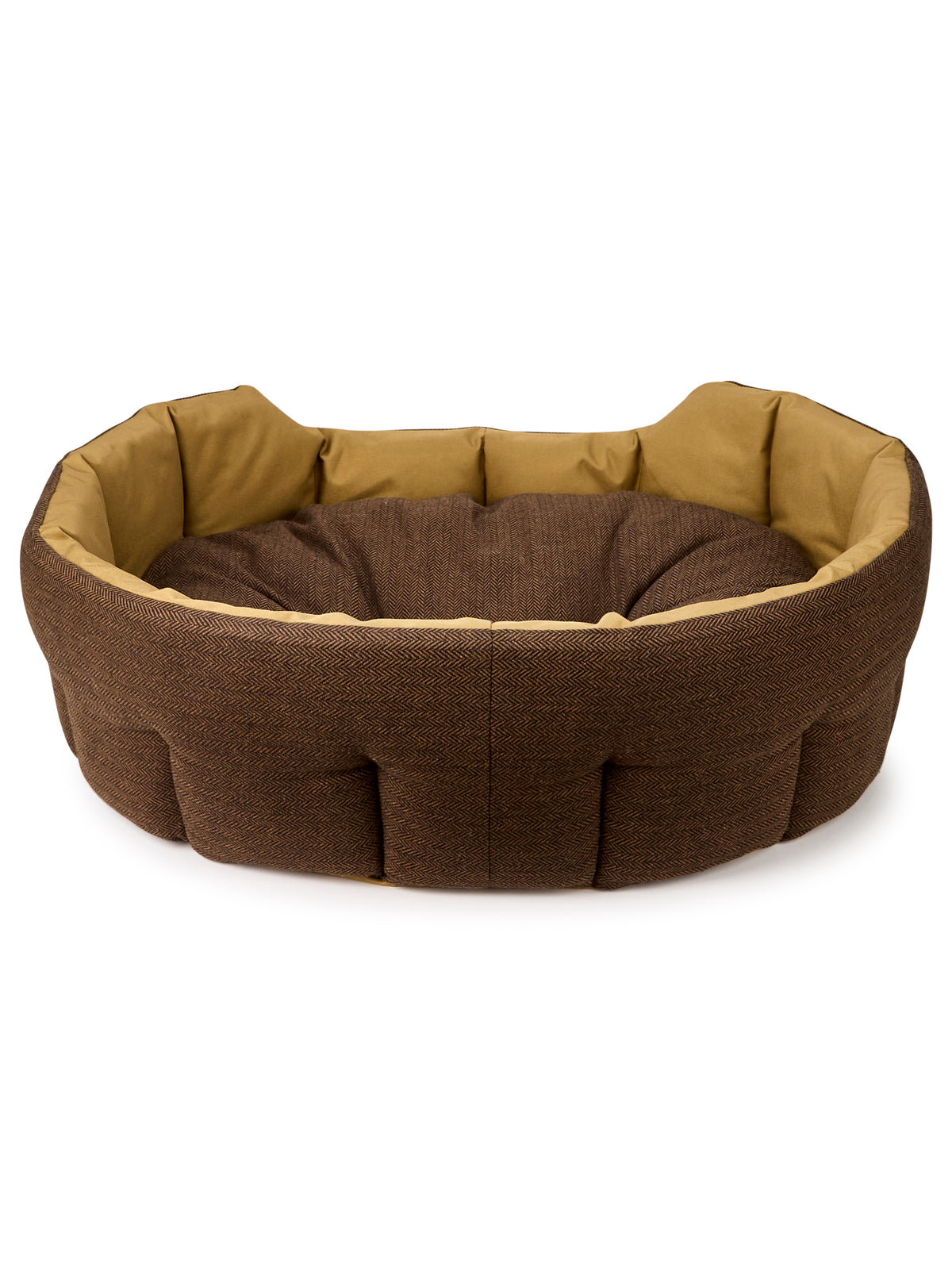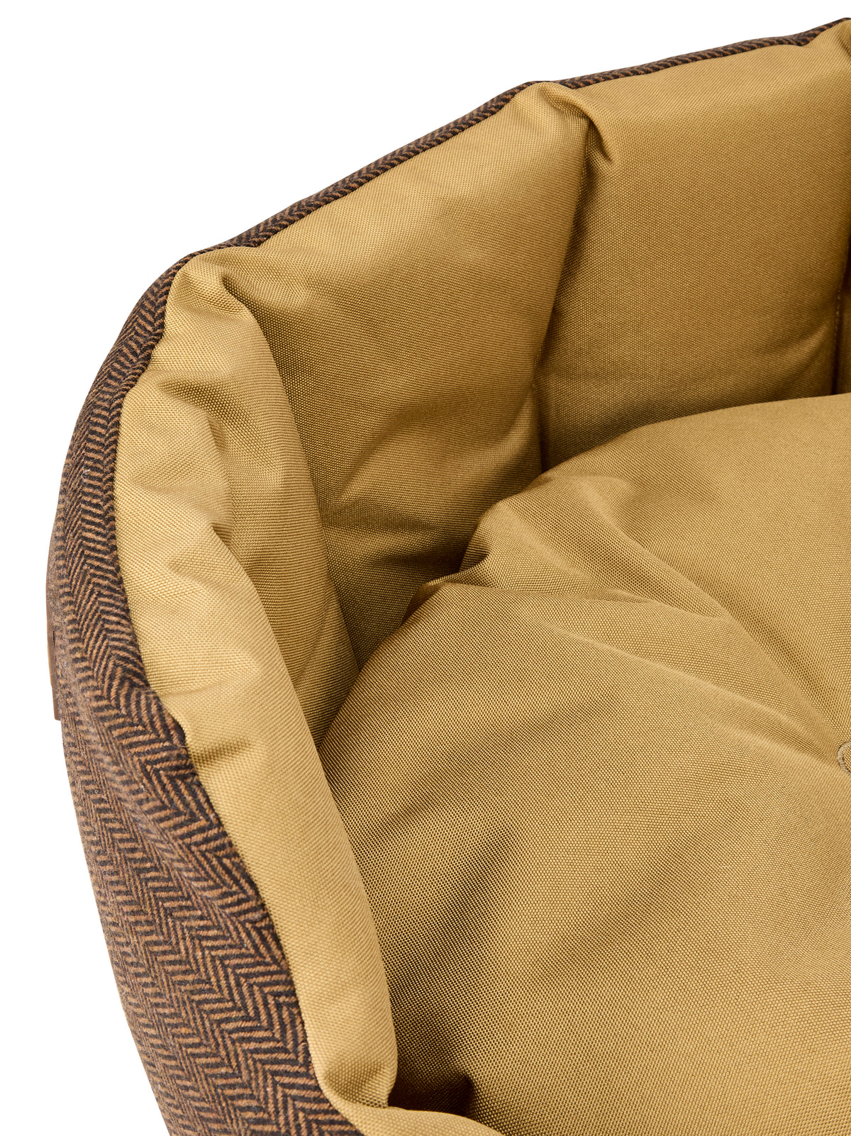 Die perfekte Ruheoase für müde Pfoten: Dieses elegante Hundebett kombiniert zeitloses Design mit maximalem Komfort. Das goldfarbene Cordura-Futter und der hochwertige, waschbare Fischgrät-Tweed machen es nicht nur besonders gemütlich, sondern auch zu einem stilvollen Blickfang – ob im Wohnbereich oder neben dem Kamin.